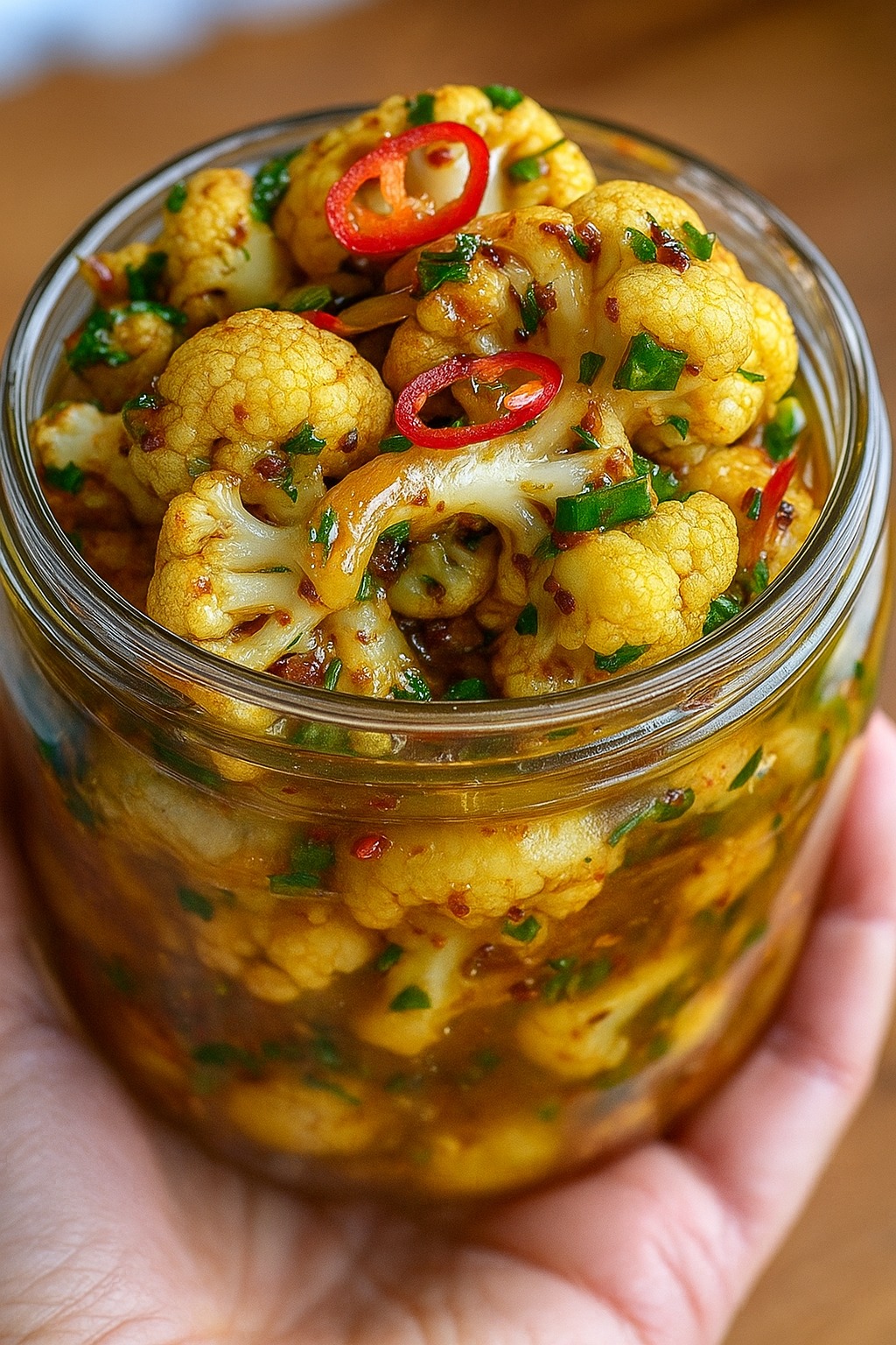 Kalafior w pikantnej marynacieSkładniki:1 średni kalafior, podzielony na różyczki¼ szklanki oliwy z oliwek2 łyżki octu jabłkowego2 ząbki czosnku, przeciśnięte przez praskę1 łyżeczka papryczki chili w płatkach (lub świeżej, drobno pokrojonej)½ łyżeczki kurkumysól i pieprz do smakuposiekana natka pietruszki lub kolendra (opcjonalnie)Sposób przygotowania: