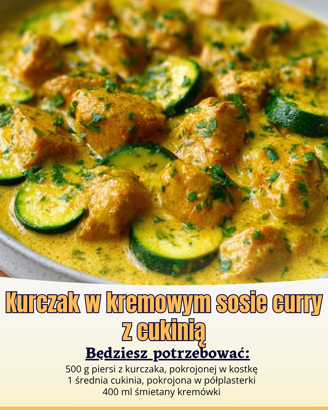 Składniki: 500 g piersi z kurczaka, pokrojonej w kostkę 1 średnia cukinia, pokrojona w półplasterki 1 cebula, drobno posiekana 2 ząbki czosnku, przeciśnięte przez praskę 400 ml śmietany kremówki 2 łyżki pasty curry Sól i pieprz do smaku 2 łyżki oleju roślinnego Świeża natka pietruszki do dekoracji